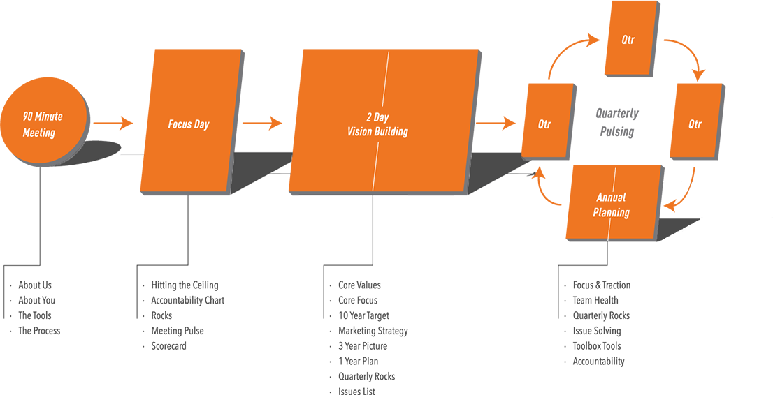 The EOS Process™ provides a proven way to put all the pieces together, incorporating each of the EOS® Tools in the right order to best strengthen each key component of your business. The process provides structure and accountability to your organization accelerating results and fostering alignment on where you need to go and how to get there.