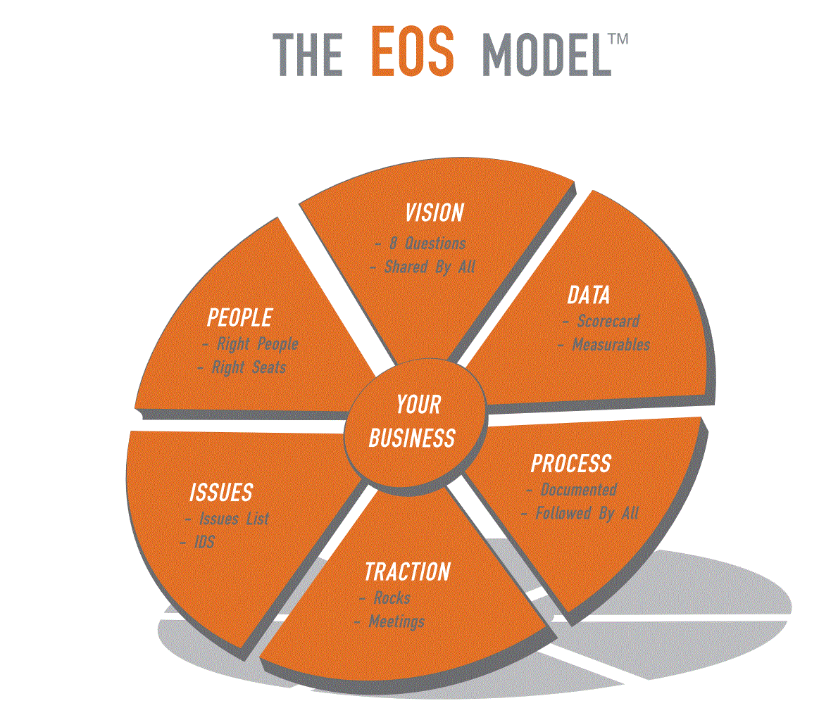 Holistic Model and Approach. EOS doesn’t treat symptoms – it helps you cure the “whole body” by strengthening the Six Key Components™ of your business – Vision, People, Data, Issues, Process, and Traction.